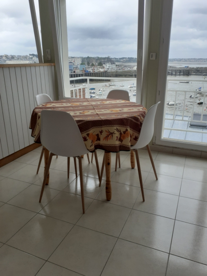 Le coin repas dispose d'une table, d'une allonge et de quatre chaises.