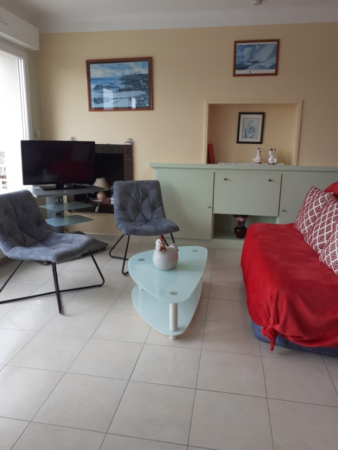 Le coin salon avec canapé convertible type BZ, table de salon, meuble de rangement et télévision.